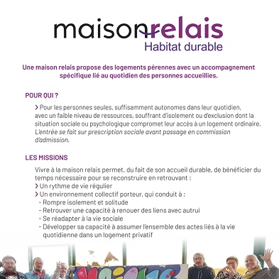 La document présente la Maison Relais, offrant des logements pérennes avec un accompagnement adapté au quotidien des personnes accueillies. Elle cible des personnes seules, autonomes mais à faibles ressources, souvent isolées ou en situation d’exclusion.
