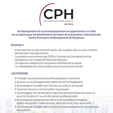 Le document présente le CPH (Centre Provisoire d’Hébergement) du Jura, offrant 50 places d’hébergement pour les bénéficiaires de la protection internationale à Dole et ses environs. Il décrit les missions principales, incluant protection, accompagnement administratif et social, accès à la santé, insertion professionnelle et soutien à la parentalité.