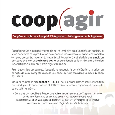 Le document présente Coop(Agir, association œuvrant pour l’emploi, l’intégration, l’hébergement et le logement, avec pour ambition de renforcer la cohésion sociale et la solidarité sur le territoire. Il détaille les principes et valeurs de l’association, fondés sur le respect, la dignité, la lutte contre les exclusions et la promotion de la justice sociale.