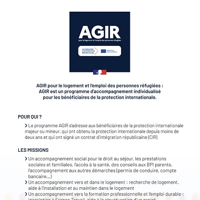 Le document présente le programme AGIR, un dispositif d’accompagnement individualisé destiné aux bénéficiaires de la protection internationale récemment reconnus. Il détaille les missions du programme, couvrant l’accompagnement social, l’accès au logement ainsi que l’insertion professionnelle et la formation.