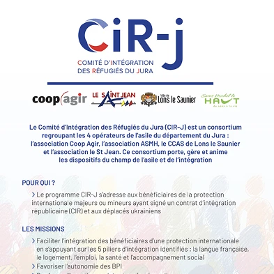 Le document présente le Comité d’Intégration des Réfugiés du Jura (CIR-J), consortium de quatre opérateurs de l’asile coordonnant les dispositifs d’intégration dans le Jura. Il cible les bénéficiaires de la protection internationale et les déplacés ukrainiens, avec pour mission de favoriser l’autonomie, l’insertion sociale et professionnelle.